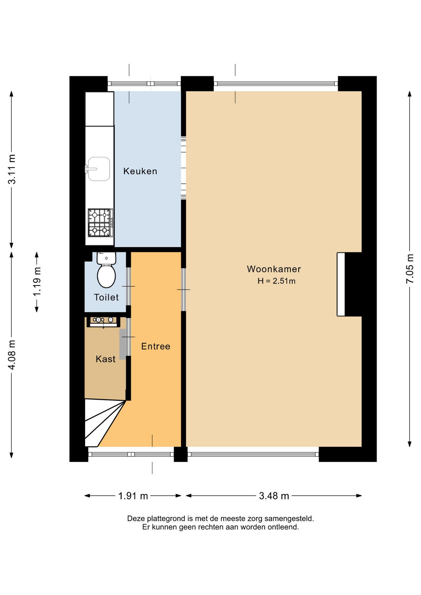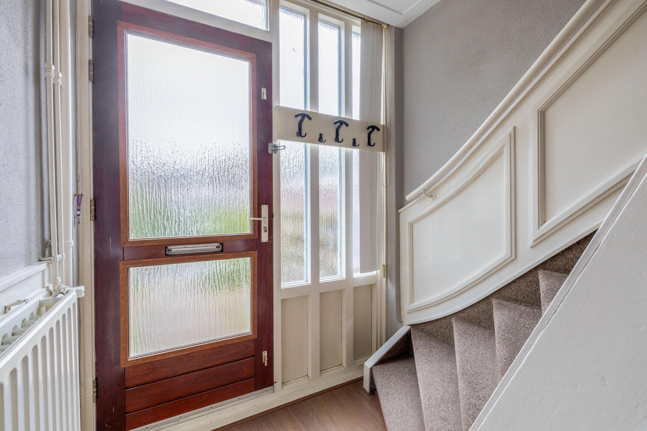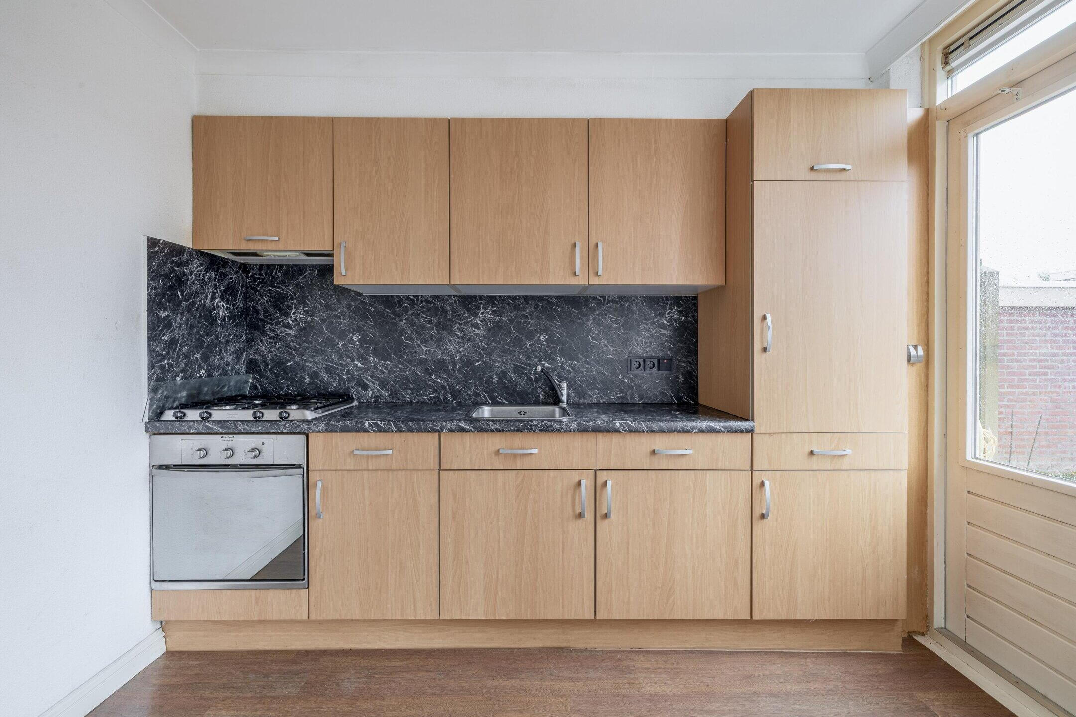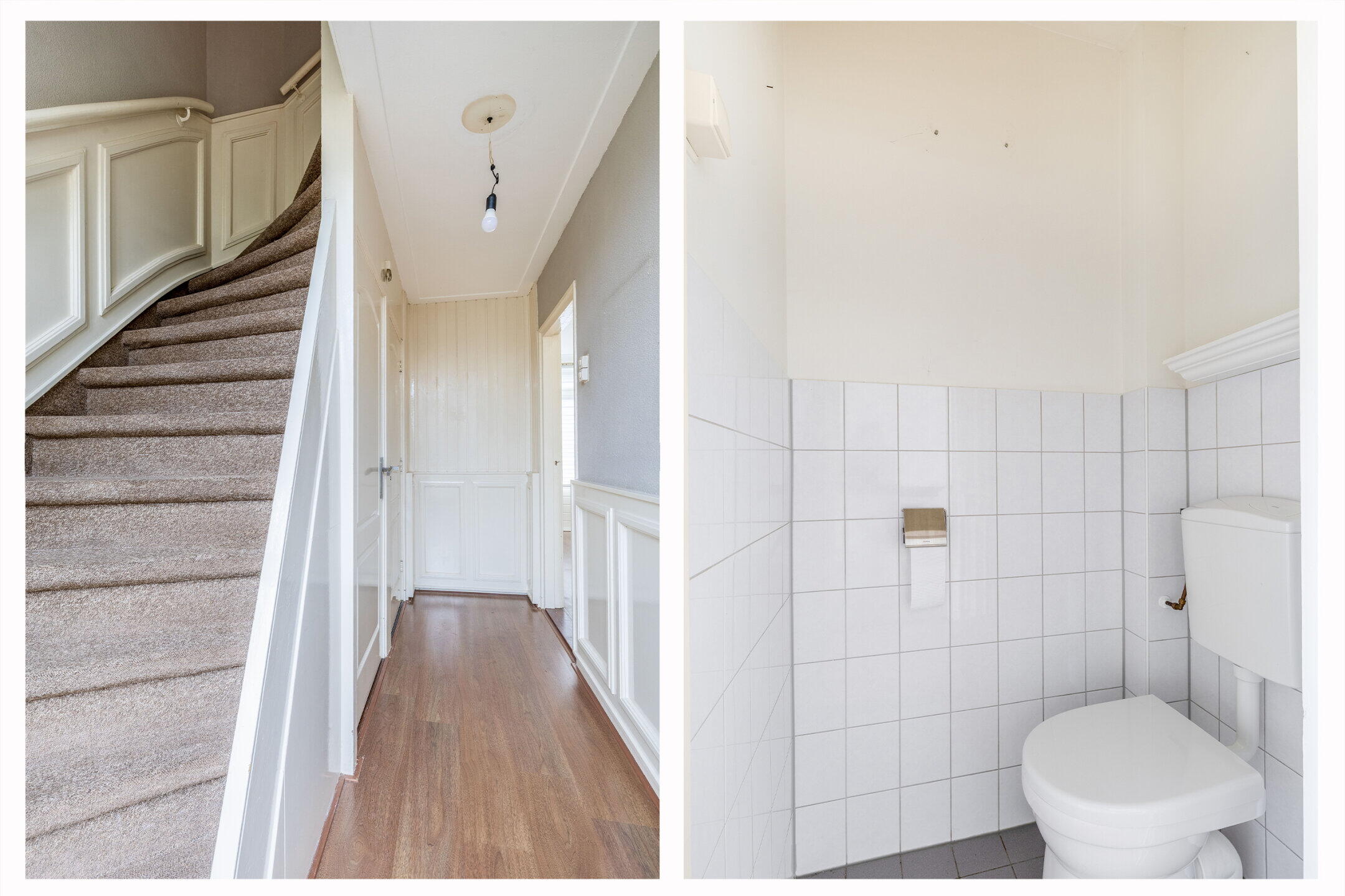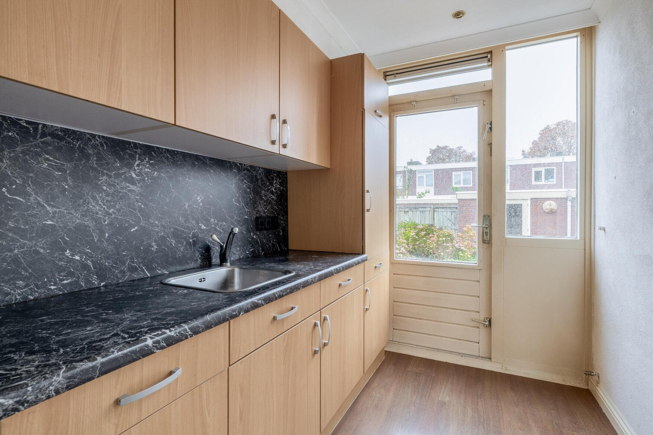 entree, hal met gecombineerde kelder-/meterkast, verzorgd toilet, ruime woonkamer, dichte keuken met keukenopstelling en deur naar de achtertuin.