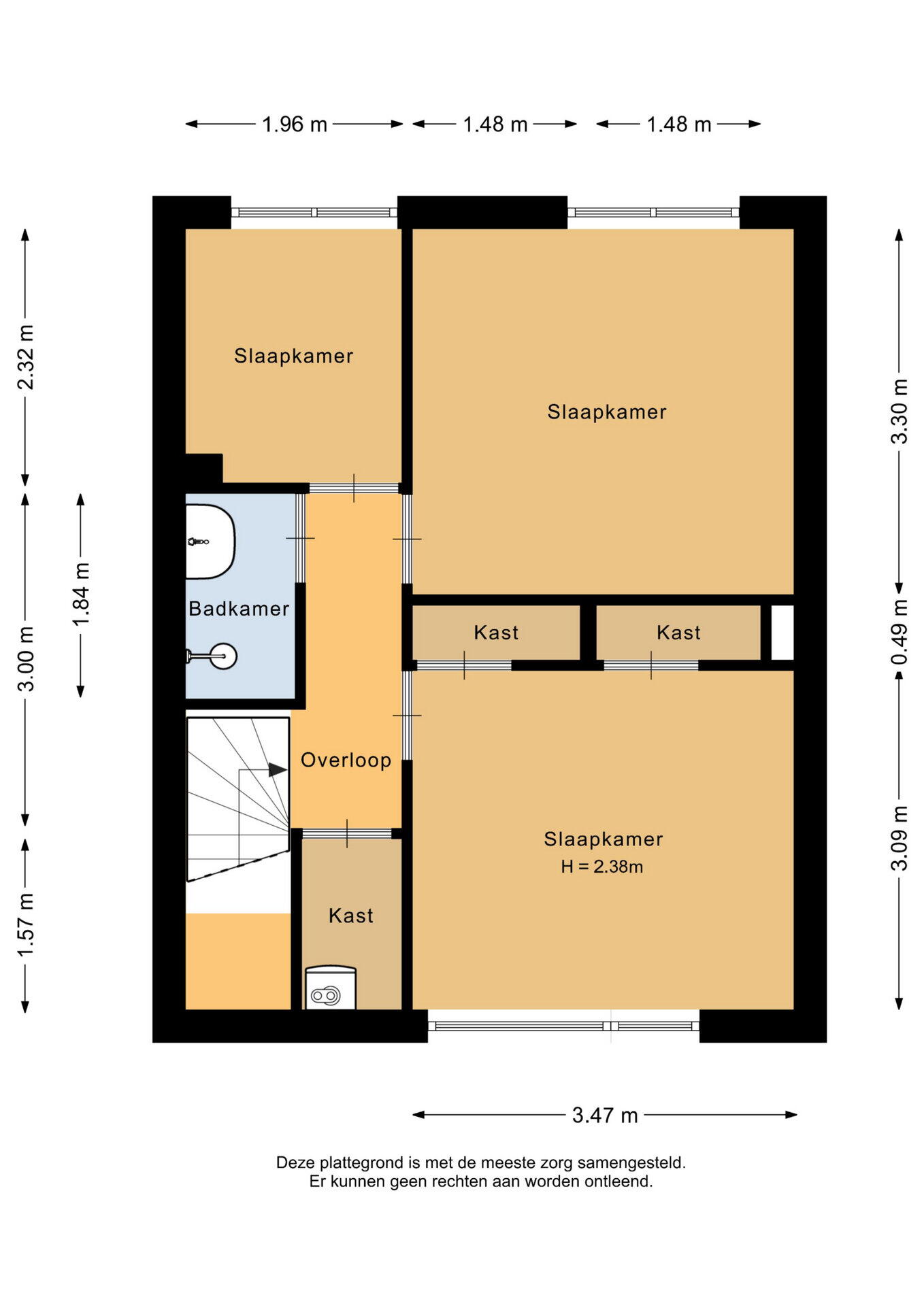 Op de verdieping zijn er: een overloop met c.v.-installatie, 3 slaapkamers en een nette eenvoudige badkamer met douche en wastafel.